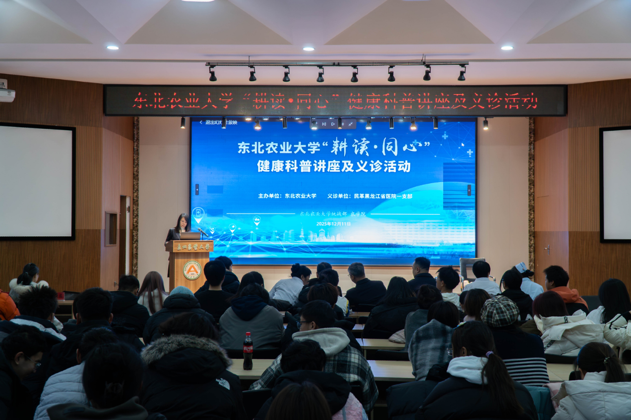 12月11日,统战部与农学院在音乐厅联合举办了“耕读・同心”健康科普校园行活动。活动特邀民革黑龙江省医院一支部的医疗专家团队进校,通过科普讲座与现场义诊相结合的形式,为全校师生送上专业便捷的健康服务。民革黑龙江省委常委、组织部部长严书战出席活动。我校农学院党委书记李晓书,党委副书记马涛,民革东北农业大学主委才华,区域协同高校教师以及我校各学院师生共同参与活动。活动由我校统战部副部长孙晔主持。